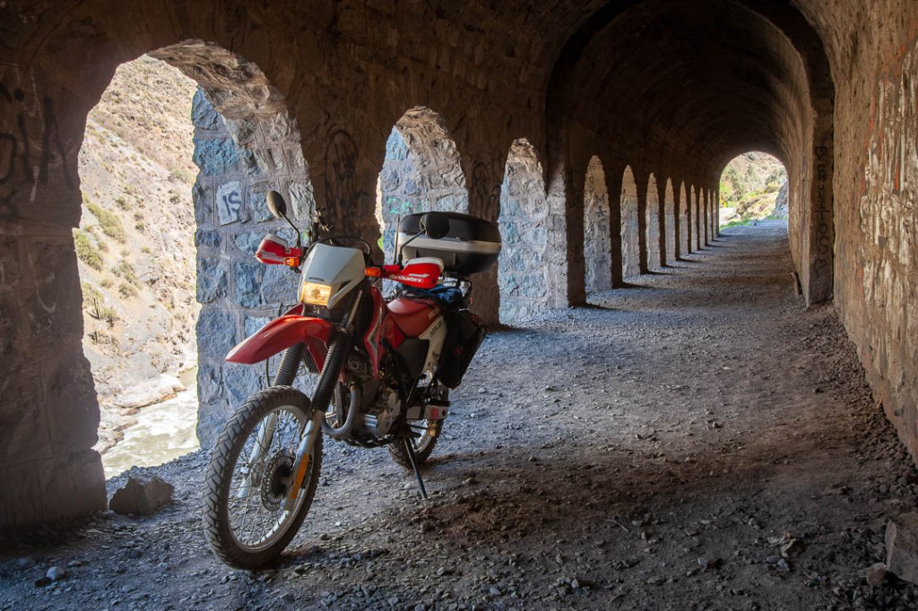 La primera vez que crucé no hubo detenciones: ruta-túnel-ruta, y recuerdo muy bien lo oscuro que estaba, especialmente considerando que la luz de la Tornado ilumina poco, no lograba ver el terreno y me generaba algo de ansiedad. Ahora que me detuve por las fotos al inicio, ¡al cruzarlo podía ver todo muy bien! Hacían falta esos pocos minutos para que los ojos se ajustaran a la oscuridad solamente (o un par de luces auxiliares, jeje). Recordar para los túneles futuros.