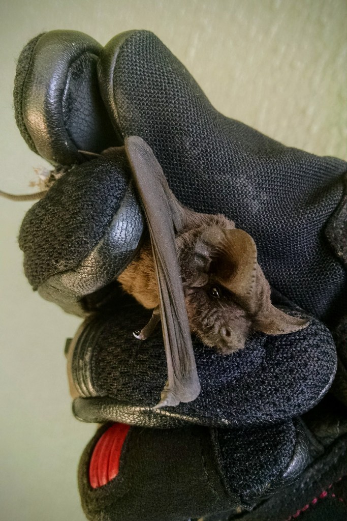 Si el murciélago está en un lugar donde no moleste, se le puede dejar tranquilo—sólo está durmiendo—con las ventanas abiertas y saldrá solo cuando anochezca. Si está en un lugar más complicado, se puede atrapar en una caja y liberarlo de noche. Es importante no manipularlo con las manos desnudas, aunque cualquier guante más grueso que uno de lavar podría servir, haciéndolo con cuidado.