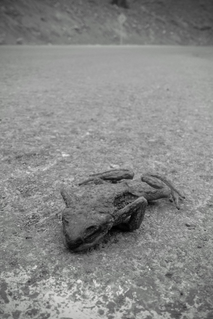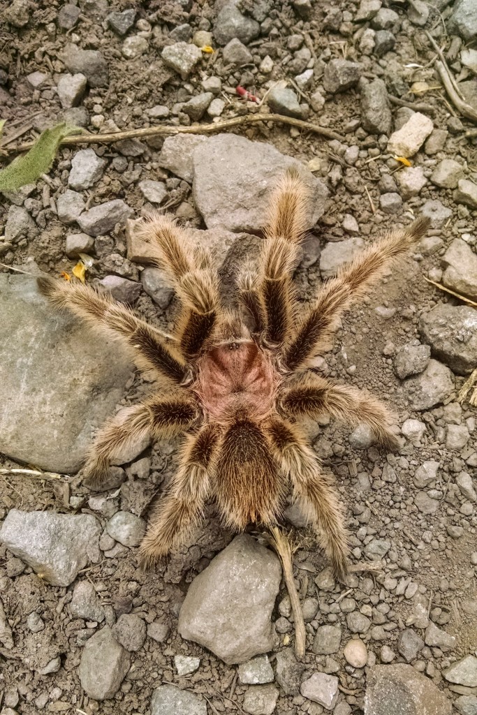 A medida que bajábamos, justo por un sector donde el camino cruza con un riachuelo, un pequeño sapo espinoso muerto, muy probablemente atropellado. Es un problema muy recurrente, incluso se han reportado por ese sector en ocasiones decenas de sapos atropellados en pocos metros, es difícil que todos bajen la velocidad y hay que partir por uno mismo, pero también ayudaría si se pusieran señaléticas o reductores de velocidad sólo en esos sectores. ¿Bajarían la velocidad si vieran un cartel que dijera “Cruce de anfibios adelante”? Ya varios kilómetros más abajo vimos una araña pollito que iba cruzando el camino, nos detuvimos y la ayudamos a apresurarse y llegar a la seguridad del matorral. Tratando de hacer una diferencia.