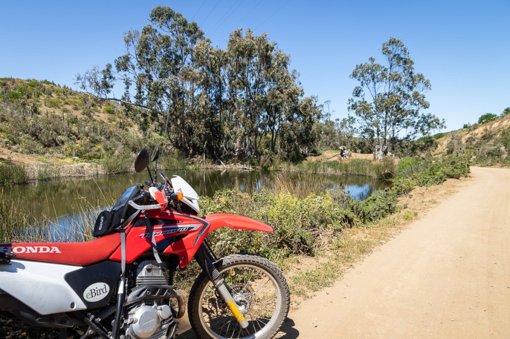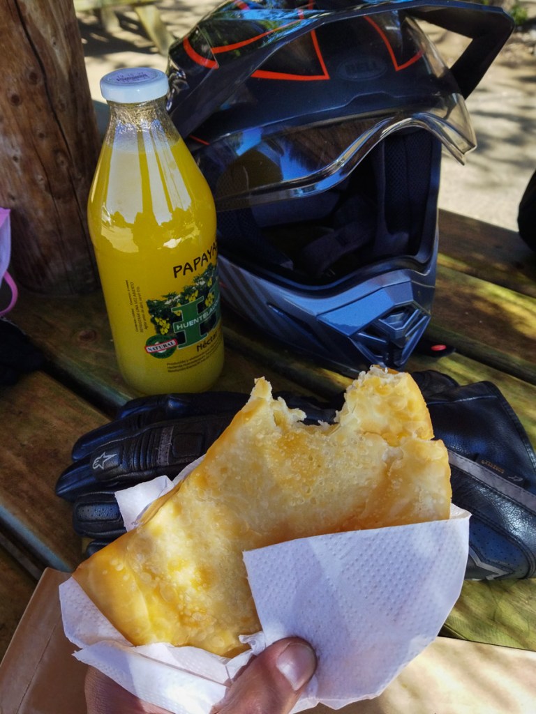 Cuando nos acercábamos a Huentelauquén ya iban a ser las 16:00, llevábamos casi 4 horas y media de viaje, y a pesar de que ya era parte del plan, los múltiples carteles que aparecían al costado de la carretera anunciando empanadas generaban la anticipación de que pronto podríamos almorzar. La primera vez que visité el lugar fue durante unos censos de aves el 2018 y luego en cada terreno camino al parque eólico es la parada a almorzar, todas las veces me imaginaba poder llegar un día en la moto… ¡Y así fue esta vez!