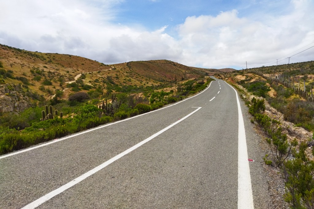 Para no desaprovechar la belleza del paisaje retornando directo hacia la autopista, revisé las rutas para poder explorar y me pareció buena idea tomar el camino de Canela Baja > Agua Fría > Mincha > Huentelauquén, esto mediante las rutas D-787 y D-949. ¡Cada kilómetro que avanzaba por la ruta me alegraba de haberla elegido! El paisaje estaba lleno de cactus en flor, parches de huilli (Leucocoryne) de distintos colores, cerros cubiertos de amarillo y verde… Todo esto mientras se recorre un camino pavimentado con subidas y bajadas, además de curvas bastante entretenidas, a ratos me hacía pensar en el recorrido de una montaña rusa. Más adelante se encontraba la Cuesta La Flojera, que en su punto más alto tiene unos 635 m de altura, su pendiente es algo pronunciada y con bien cerradas en algunos momentos. ¡Pasó un cóndor volando a gran altura por aquí!