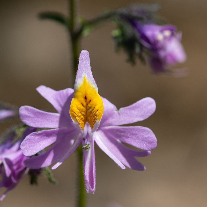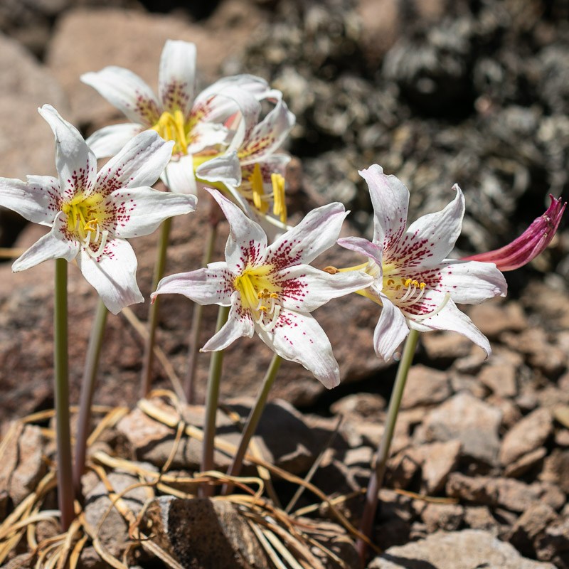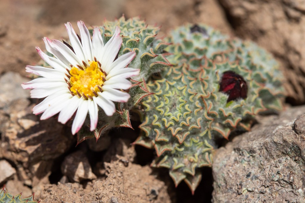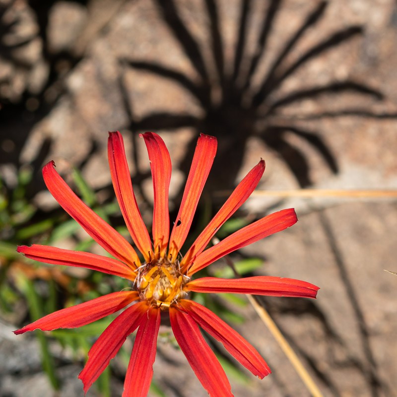 Luego de hacer reponer un poco de energías, comenzó el descenso, donde aprovecharía de explorar un par de huellas más que siempre me habían llamado la atención al pasar por el camino. Mientras, el cielo comenzó a nublarse en el este y un fuerte viento llegaba desde el oeste. En una detención, por pura casualidad me fijé en unas diminutas flores al borde del barranco, ¡eran preciosas y nunca las había visto antes!