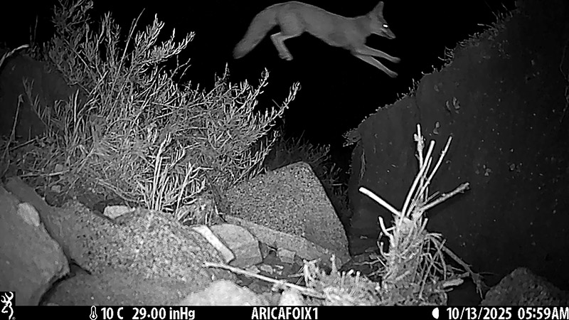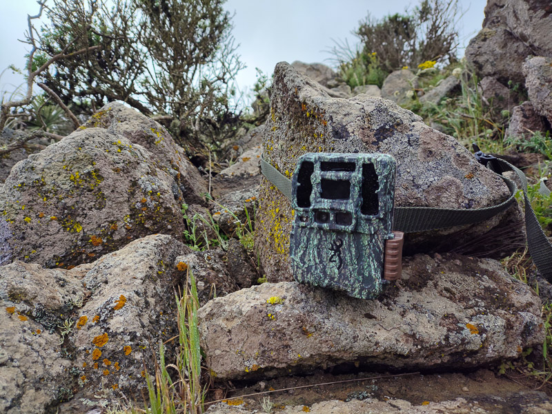 Finalmente, la última adición al equipo, una cámara trampa. Este dispositivo se activa cuando detecta movimiento frente a sus sensores, permitiendo fotografiar potencialmente fauna que transite por el lugar tanto de día como de noche. Al igual que el micrófono autónomo, puede dejarse por días o semanas en terreno.