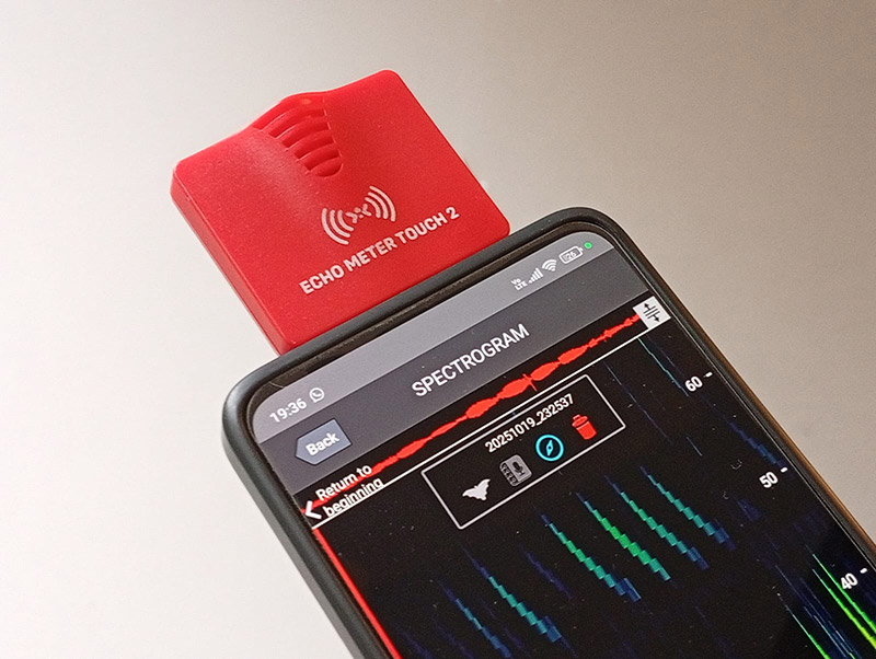 Este ya lo tengo de hace algún tiempo. Este dispositivo, que corresponde a un micrófono, se conecta vía USB al celular y permite registrar los sonidos en el rango inaudible, es decir, ultrasonidos. Sirve para la detección de murciélagos durante la noche, cuando usan su ecolocalización para ubicarse en el espacio mientras vuelan y encontrar a sus presas en el aire.