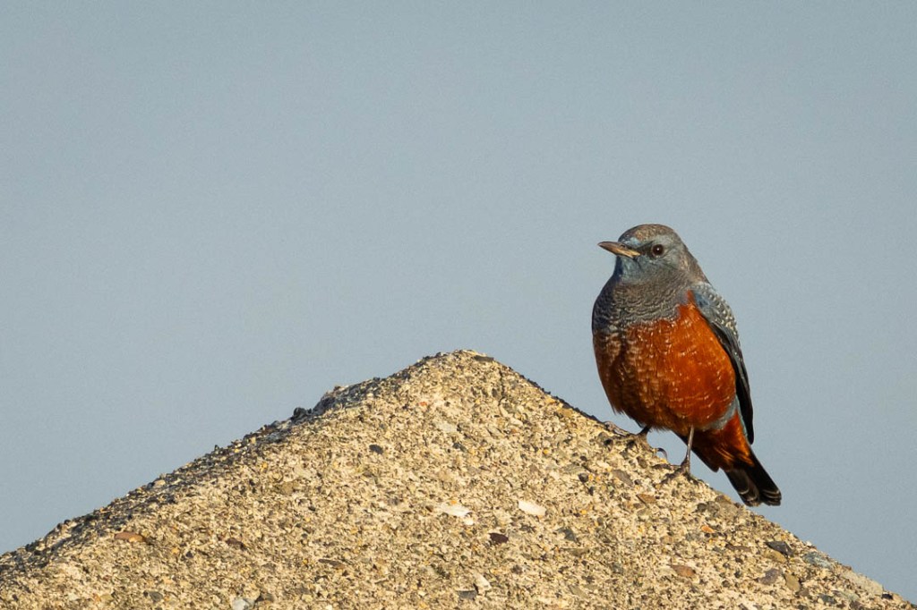 Salí hacia la costa para ver el mar durante los últimos minutos de luz. Corría mucho viento y me tuve que cubrir atrás de una pared mientras tomaba fotos. Al otro lado de la calle, sobre los rompeolas, pude ver a un Blue Rock-Thrush haciendo exactamente lo mismo.
