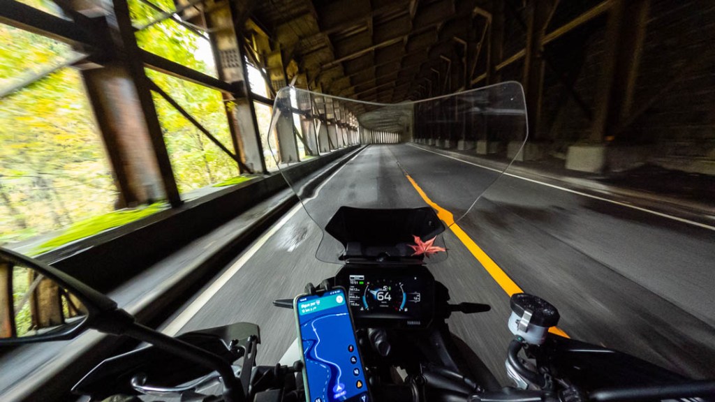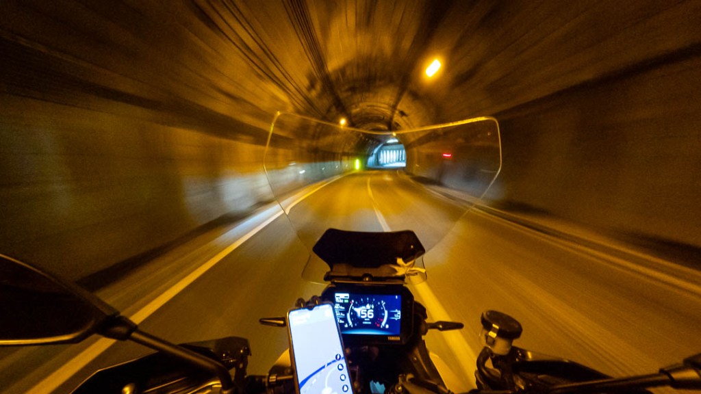 Comenzó a lloviznar y pronto llegamos al tramo de los túneles, los que espaciaban los ratos de gotas sobre el casco. Pasar por los túneles con “ventanas” generaba un rico efecto de trémolo sobre el sonido del escape de la moto, ¡así que disfruté cada sección!