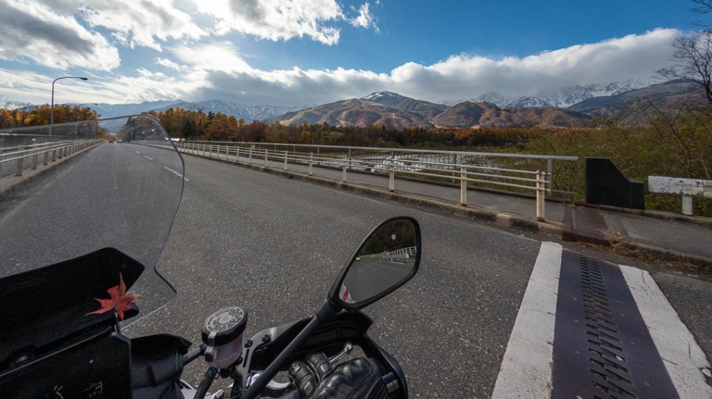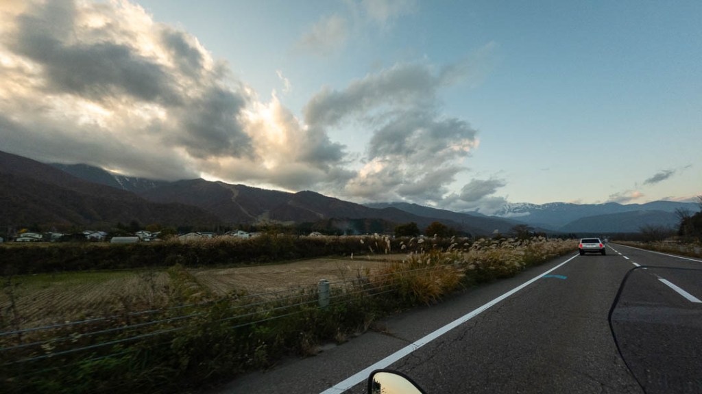 Cruzamos las localidades de Hakuba y Otari, que lucían su estilo de pueblo estrechamente ligado a la cultura de nieve y los deportes de invierno. Nuestro camino ahora se extendía junto al río Himekawa, el cual serpenteaba en el crepúsculo, acompañándonos con sus aguas en dirección al norte, mientras nos cambiábamos de orilla entre puentes y túneles.