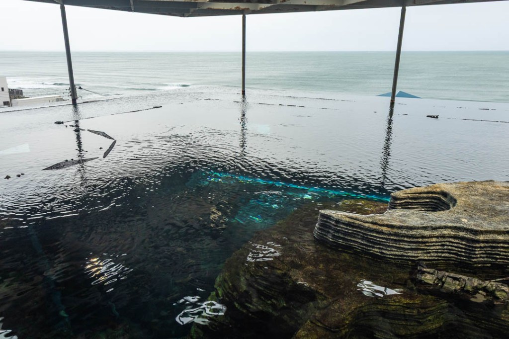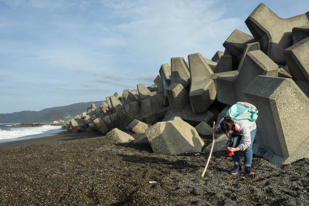 Caminamos junto a una costa con un perímetro de grandes rompeolas de hormigón hasta llegar a la playa de jade. Y después de una caminata casi sin toparnos con gente, vimos que este era el lugar donde se concentraba la multitud… De unas diez personas. ¡Fantástico!