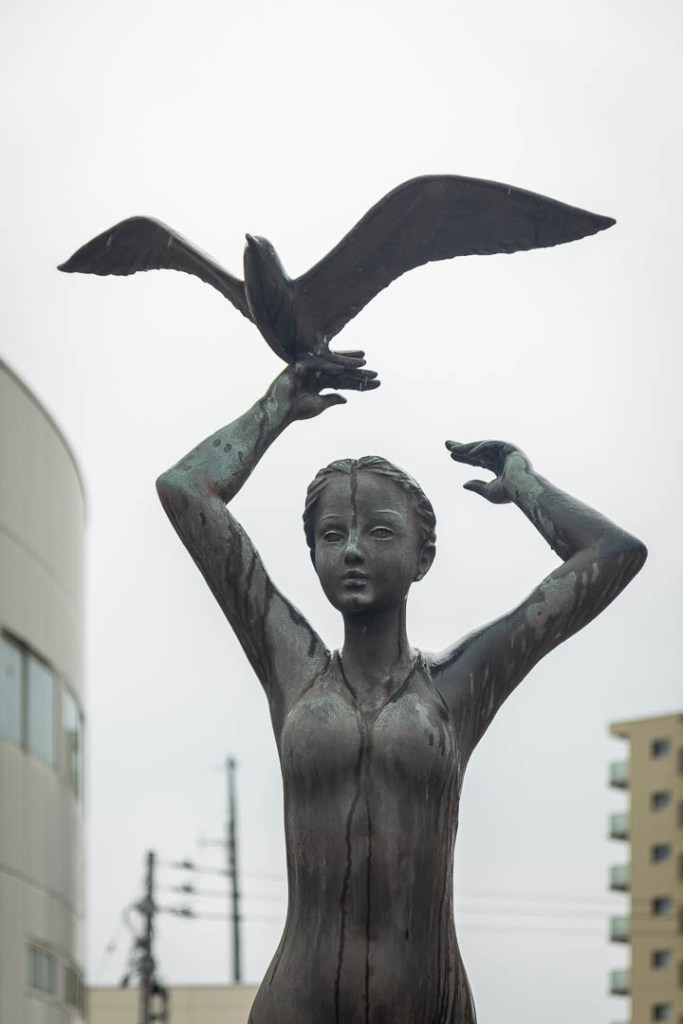 Llegamos a la estación Naoetsu y la lluvia continuaba. Afuera de la estación una estatua llamó mi atención de inmediato, ya que varias gaviotas formaban parte de ella.