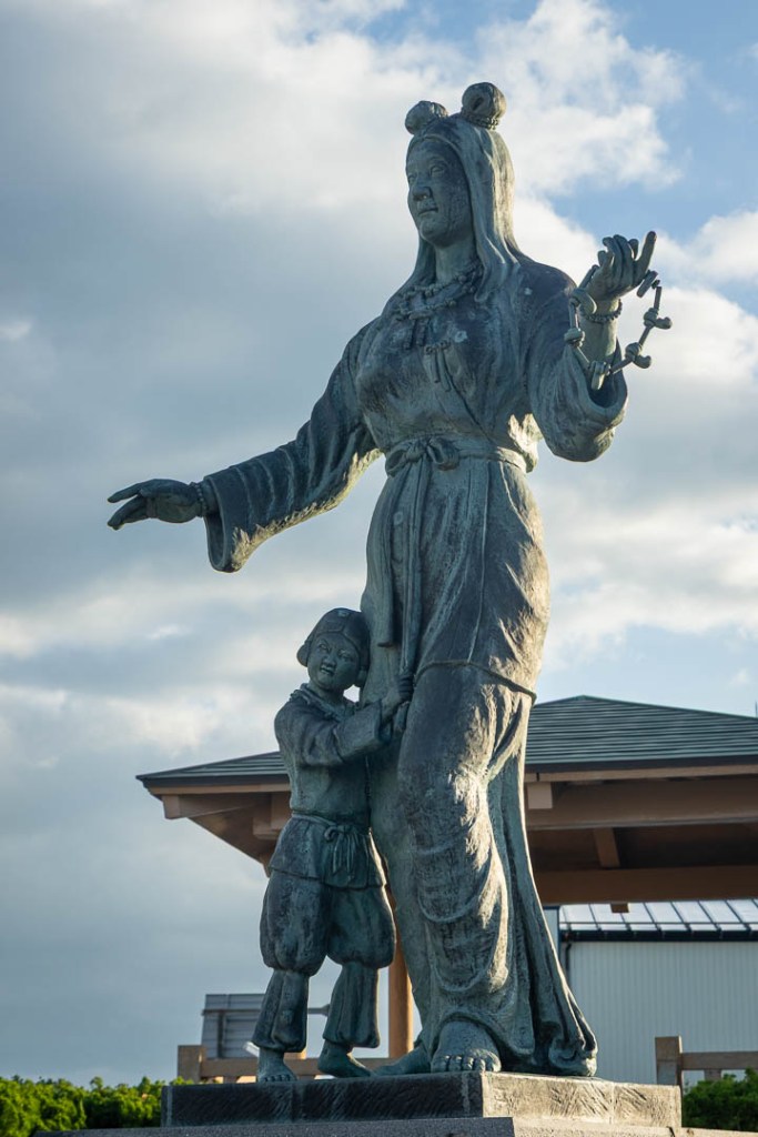 Llegué al parque Ekimae Kaibo, donde conocí a la princesa Nunagawa. Su estatua miraba hacia el mar y, junto a ella, estaba escrita su leyenda: