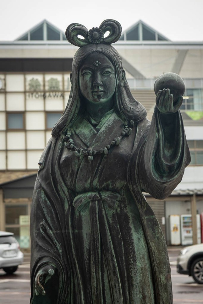 El texto histórico más antiguo de Japón, el Kojiki (ca. 710), registra la leyenda de Yachihoko-no-Kami y su viaje desde la lejana provincia de Izumo para pedirle a la princesa Nunakawa que se casara con él. Los dos dioses tuvieron un hijo, Takeminakata-no-Kami (mejor conocido como Okuninushi-no-Mikoto), quien es venerado como la deidad del gran santuario Suwa, el principal santuario de la prefectura de Nagano. Es por esto que muchos santuarios Suwa pueden encontrarse alrededor de Itoigawa.